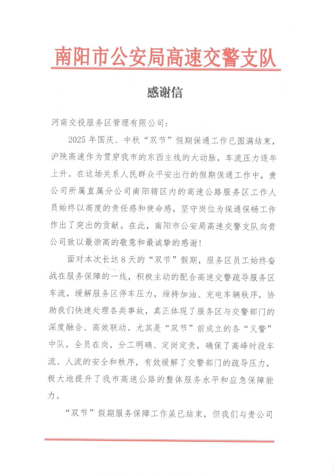 《一封感謝信 濃濃服務(wù)…》 10月10日,南陽(yáng)市公安局高速交警支隊(duì)向公司所屬直屬分公司寄來感謝信,表達(dá)對(duì)南陽(yáng)轄區(qū)內(nèi)…